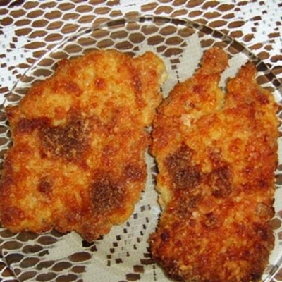 A húst kiklopfoljuk, majd besózva kicsit állni hagyjuk, a szokásos módon bepanírozzuk. Tepsibe sütõpapírt teszünk, ráhelyezzük a hússzeleteket. Mindkét oldalukat olajjal megkenjük, majd 150 fokos sütõben kb. 1 óra alatt készre sütjük. Sütés közben, ha már a felsõ része kezd pirosodni, átfordítjuk, hogy a másik oldala is megpiruljon.