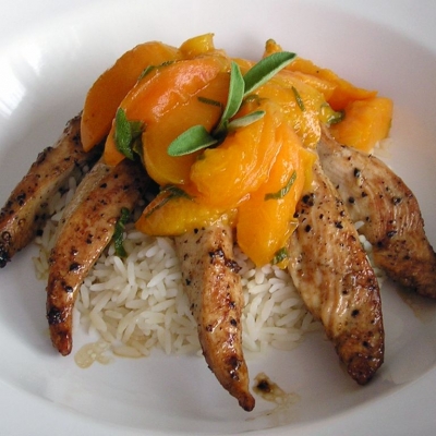 A csirkemelleket megtisztítjuk, megmossuk. Az olaj felét összekeverjük a gyömbérrel, a mézzel, őrölt borssal ízesítjük, és a húsokra kenjük. Letakarva hűtőbe tesszük 1 napra. Sütés előtt a húst beszórjuk a fűszerkeverékkel. A maradék olajat egy mélyebb serpenyőben felmelegítjük, és a csirkemelleket lassan, ha kell, félidőben letakarva, megsütjük. A barackokat megmossuk, felezzük, és eltávolítjuk a magokat. Az újhagymát megtisztítjuk, fél karikákra vágjuk. Amikor a hús megsült, rászórjuk a hagymát, pár percen át pároljuk, majd a barackot is hozzáadjuk. Pici vizet öntünk alá és még 2-3 percig összepároljuk, majd tálaljuk.