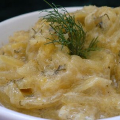 A hagymát apró kockákra vágom, a tököt almareszelőn lereszelem, a fokhagymát fokhagymanyomón átpréselem. A hagymákat az olajon üvegesre pirítom, rádobom a szárított tárkonyt, összekeverem, beleteszem a tököt, fűszerezem sóval és borssal. Kb. 10 perc alatt majdnem puhára párolom. Végül belekverem a joghurtot és az ecetet.