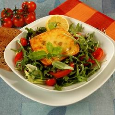 Rukkolás paradicsomsaláta sült füstölt sajttal