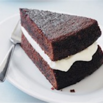 Melegítsük elõ a sütõt mérsékelten melegre (160-180 Celsius-fokra). Kenjünk ki két 22 cm átmérõjû sütõformát, és béleljük ki sütõpapírral. Szórjuk a lisztet, a szódabikarbónát, a kakaóport és a cukrot egy nagyobb tálba, majd adjuk hozzá a vajat, az ecetet és a tejet. Verjük fel elektromos mixerrel alacsony fordulatszámon egy percig, ezután adjuk hozzá a tojást, a banánpürét és a málnalekvárt, majd közepes fordulatszámon verjük további két percig. Öntsük a keveréket az elõkészített sütõbe.