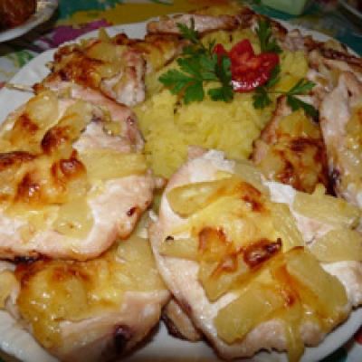 A csirkemellet sózzuk, borsozzuk, félkészre sütjük serpenyőben. Ha kicsit kihűlt, tepsibe tesszük, ráfektetjük a sonkát, az ananászkarikákat, ezek közepébe egy-két szem meggyet szuszakolunk, majd megszórjuk a reszelt sajttal. Előmelegített sütőben addig sütjük, amíg a sajt szépen megpirul. Közben elkészítjük a szószt.
