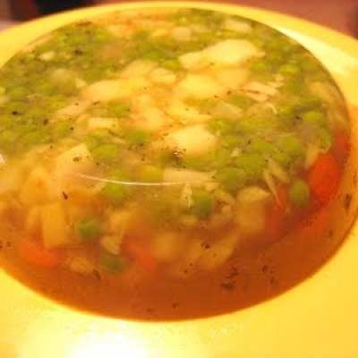 A zöldbabot és a sárgarépát megtisztítjuk, a répát felkarikázzuk, a babot leszálkázzuk, de egészben hagyjuk. Ezután külön-külön lobogó sós vízben 3 percig előfőzzük. A cukkinit héjastól hosszú csíkokra vágjuk, a paprikát kimagozzuk, és körömnyi darabokra metéljük. A felforrósított erőlevesben feloldjuk a zselatint, egy szép formájú edény aljába merünk belőle néhány kanálnyit. A zöldségeket elrendezzük benne, és a maradék levest ráöntjük. Hűtőszekrényben hagyjuk megdermedni.
